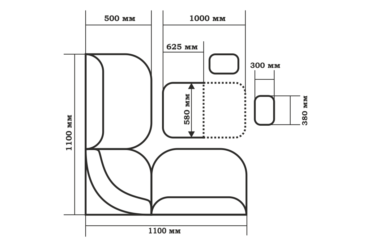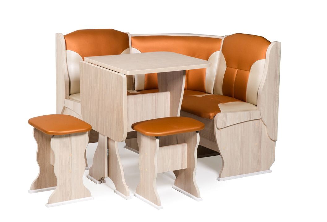 Нераскладной кухонный уголок "Нарцисс" без подлокотников, оснащен ящиком с угловой полкой для кухонных принадлежностей. В комплект кухонного уголка "Нарцисс" входит  складной стол и два табурета. Возможно исполнение как с левосторонним, так и правосторонним углом.